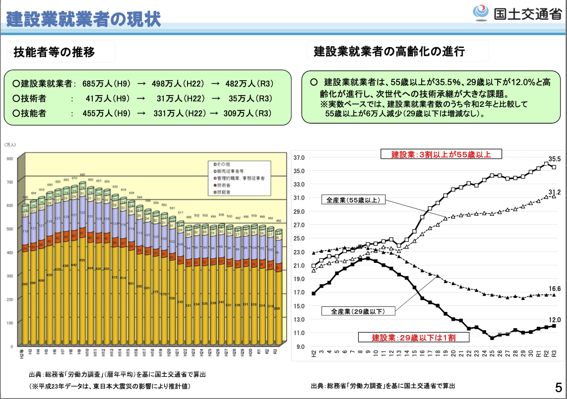 建設業の就業者数と技能者数の推移 – 国土交通省. https://www.mlit.go.jp/common/001476831.pdf